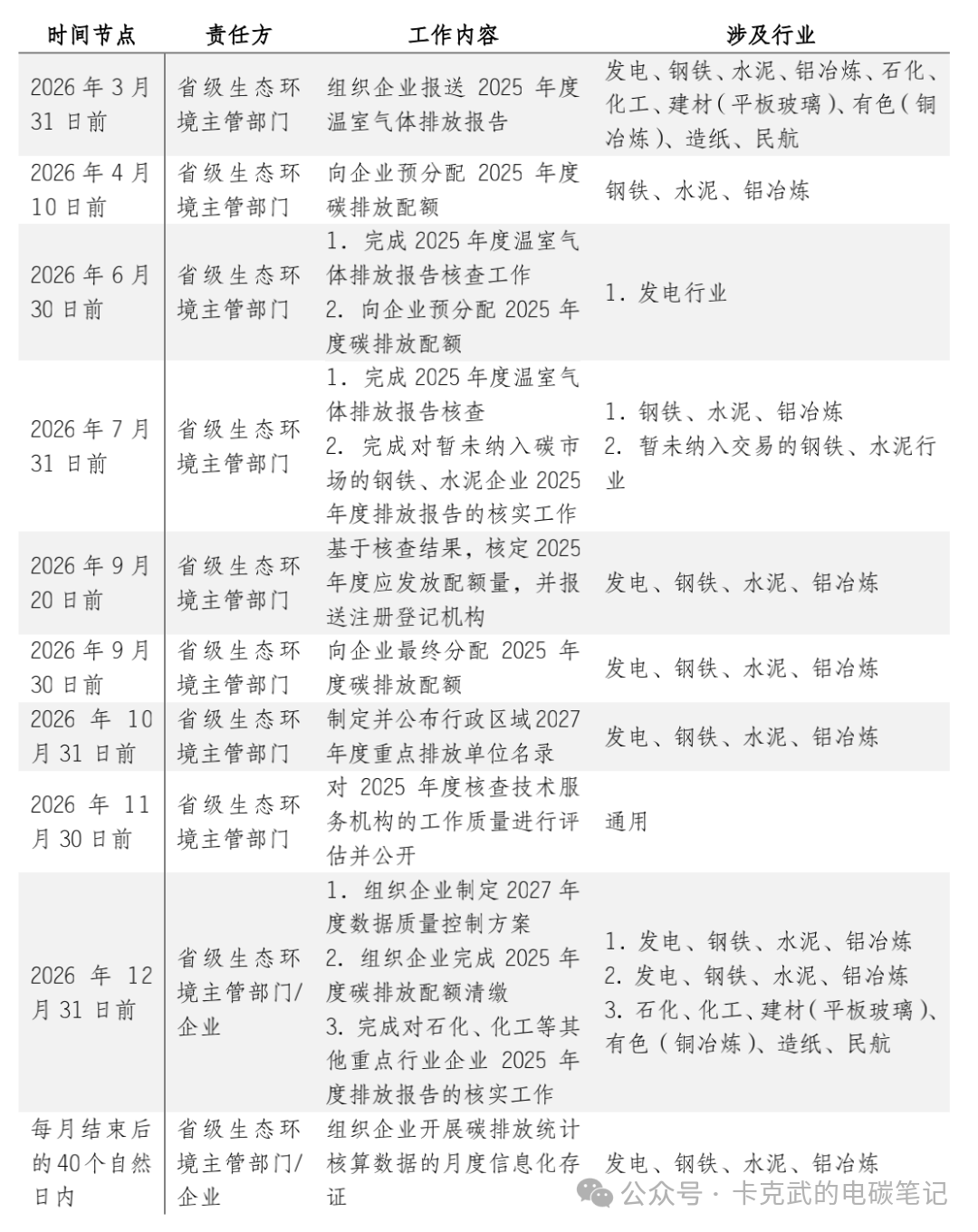 为统筹做好2026年全国碳市场管理工作,确保市场健康平稳运行,对发电、钢铁、水泥、铝冶炼等重点行业的排放单位名录管理、数据质量、配额分配与清缴等工作,以及其他待纳入行业(如石化、化工、民航等)的排放报告管理,提出了明确的具体要求和时间表。